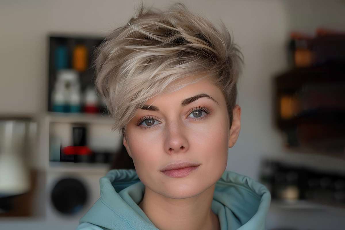 The sixth hairstyle offers a tousled, voluminous look that’s perfect for adding height and dimension. The soft blonde color paired with the choppy layers gives this style a youthful and fun vibe. It’s ideal for women who want to add movement to their short hair without losing structure. The messy, textured look is both fashionable and effortless, making it perfect for casual outings or weekends. It’s a style that looks great whether left messy or styled with a little product for more control.